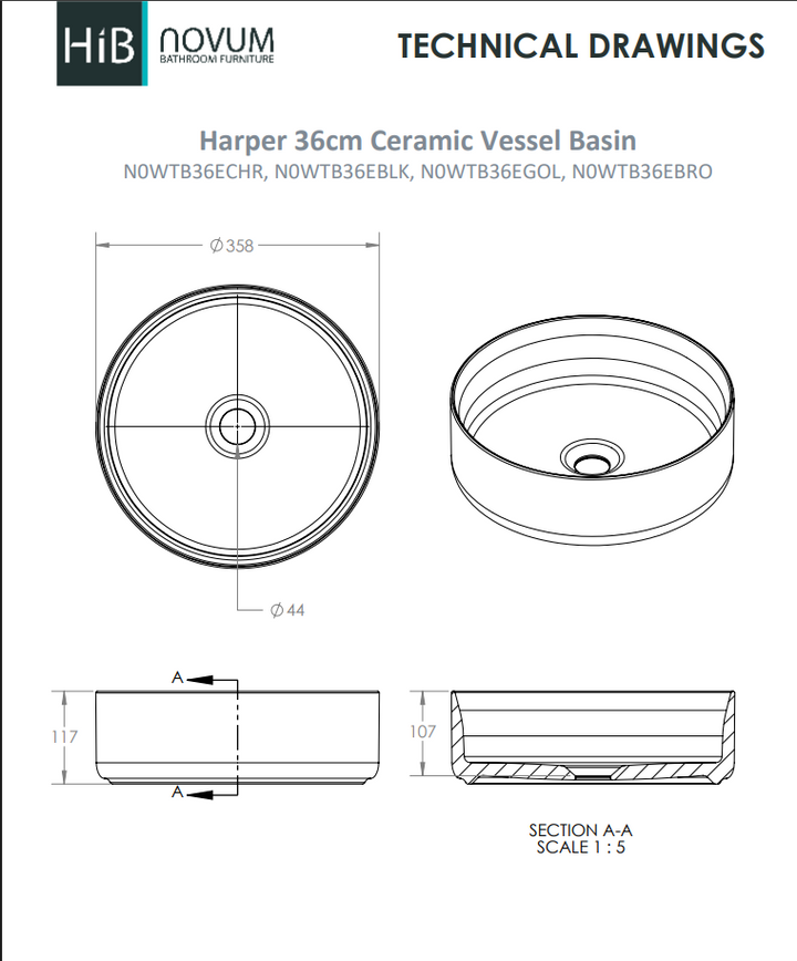 Perfect for pairing with wall-mounted or tall vessel taps, the Harper basin’s free-flowing waste design allows for effortless drainage and a clutter-free look. With its compact 36cm diameter, this basin fits beautifully on modern vanity units or countertops — ideal for both small en-suites and luxury master bathrooms.